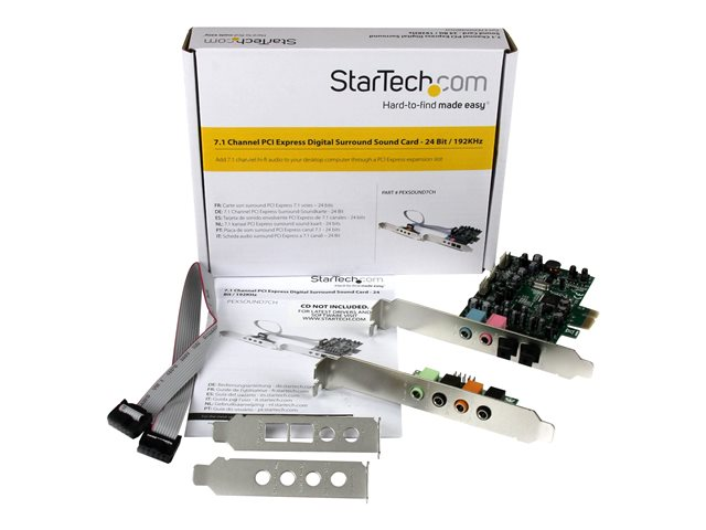 Cette carte son PCI-E 7.1 voies constituera un ajout sonore de qualité à votre home cinéma. Vous vivrez une expérience unique grâce à l'audio optique numérique cristalline de ses ports d'entrée et de sortie SPDIF. Fonctionnement polyvalent Cette carte son polyvalente sert avec un grand nombre d'appareils audio. Et avec sa sortie optique numérique SPDIF ou analogique de 3,5 mm, inutile de vous soucier du type de connexions prises en charge par vos appareils. Envoyez l'audio numérique vers votre récepteur optique ou votre DAC, ou encore l'audio analogique vers votre chaîne audio. Cette carte adaptateur son surround 7.1 aux fonctions de lecture et d'enregistrement jusqu'à 24 bits et 192 kHz produit un son haute définition d'une formidable qualité sonore. Installation simple Contrairement aux cartes son ordinaires, cette carte est conçue pour les ordinateurs compacts et donc, parfaite pour les systèmes HTPC (home cinéma sur PC). Elle répartit les multiples ports sur une carte principale plus un support en-tête novateur distinct. Cette carte comporte des supports standard et faible encombrement (demi-hauteur). Rien de plus facile que d'installer la carte son surround 7.1 voies ! C'est le choix qui s'impose pour quiconque recherche une solution simple pour améliorer le son, comme les amateurs de musique ou les professionnels du mixage. Plusieurs options de sortie Misez sur l'évolutivité en branchant rapidement un microphone ou d'autres dispositifs d'enregistrement dans les deux prises d'entrée stéréo 3,5 mm ou audio numérique SPDIF de votre ordinateur. Le modèle PEXSOUND7CH bénéficie de la garantie StarTech.com de 2 ans et de l'assistance technique à vie gratuite.