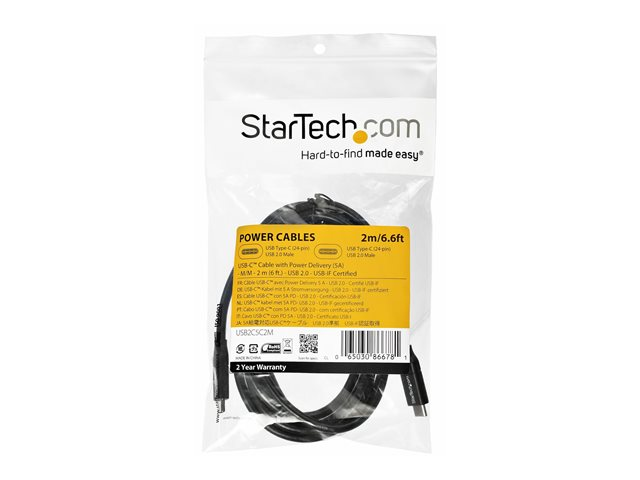 StarTech.com Câble USB-C vers USB-C avec Power Delivery 5A de 2 m - Cordon USB 2.0 Type-C certifié USB-IF - Blanc - Câble USB - 24 pin USB-C (M) droit pour 24 pin USB-C (M) droit - Thunderbolt 3 / USB 2.0 / USB 3.0 / USB 3.1 - 5 A - 2 m - noir USB2C5C2M