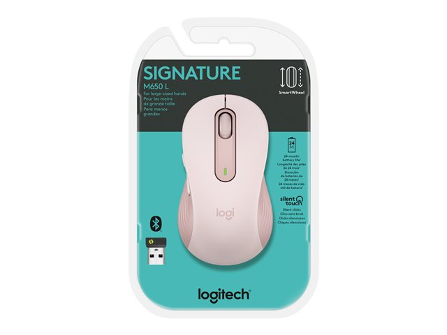 Logitech Signature M650 L - Souris - grande taille - optique - 5 boutons - sans fil - Bluetooth, 2.4 GHz - récepteur USB Logitech Logi Bolt - rose 910-006237